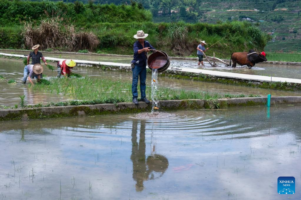 Farmers release fish fry into a rice field in Xiaozhoushan Township, Qingtian County, east China's Zhejiang Province, June 11, 2020.