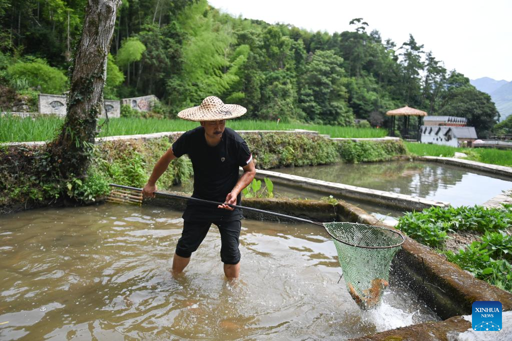 A farmer catches fish in a protection area of the rice-fish co-culture system in Qingtian County, east China's Zhejiang Province, July 19, 2022.