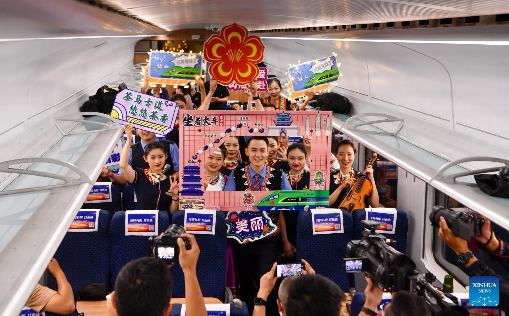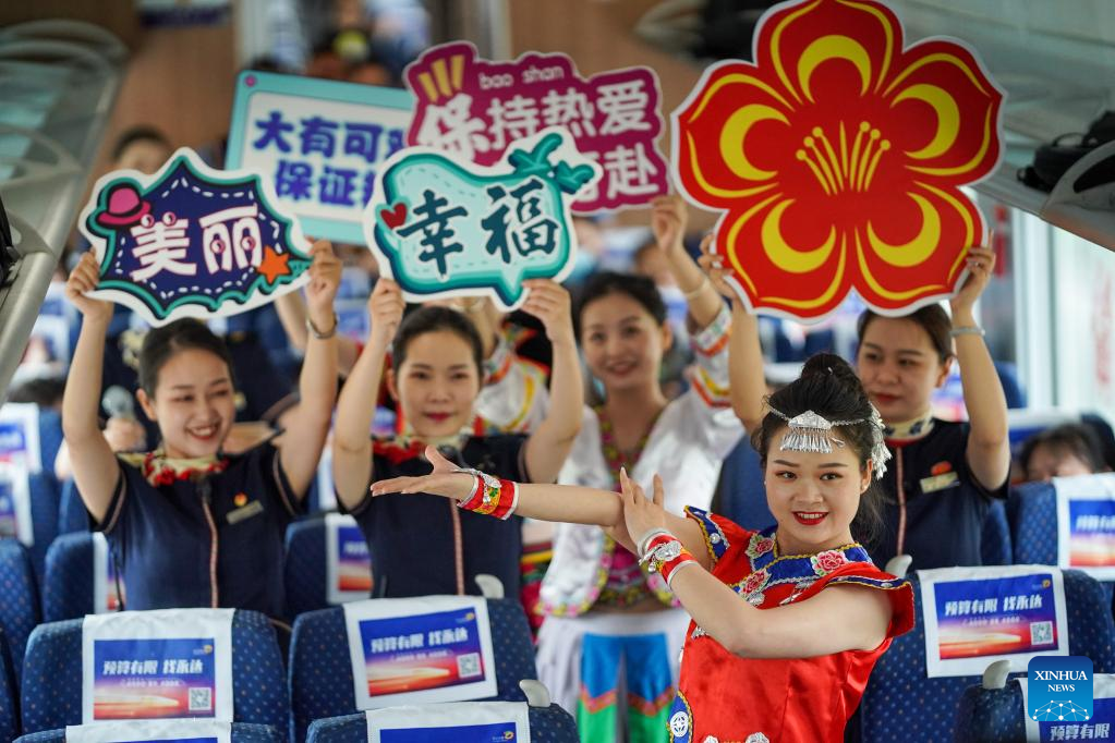 Railway crew perform aboard a bullet train running for trial along the Dali-Baoshan section of the Dali-Ruili Railway in southwest China's Yunnan Province, July 19, 2022.