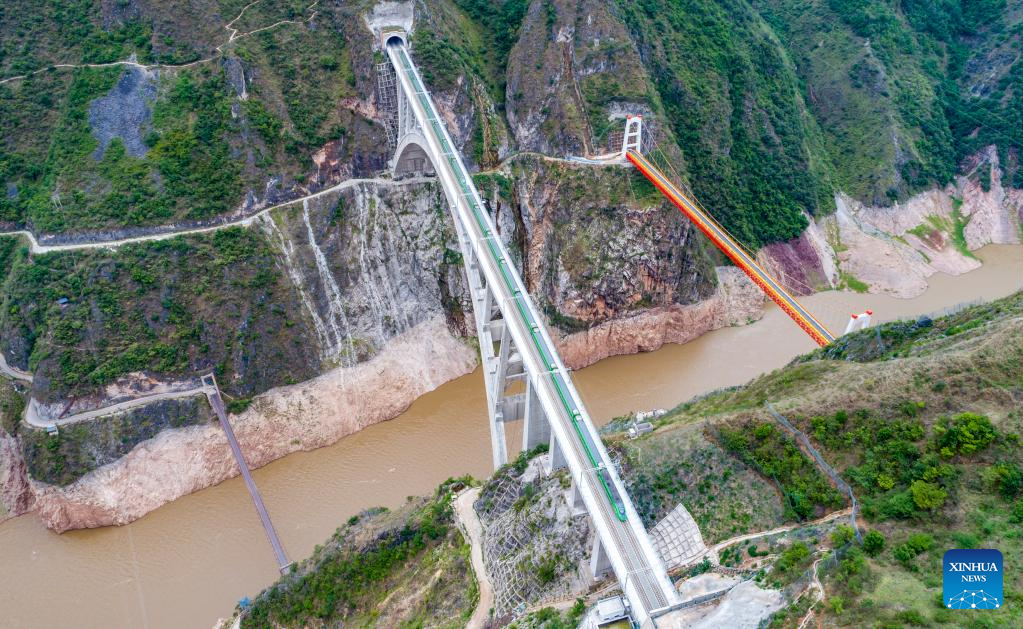 A bullet train runs for trial on the Lancang River super major bridge along the Dali-Baoshan section of Dali-Ruili Railway in southwest China's Yunnan Province, July 19, 2022.