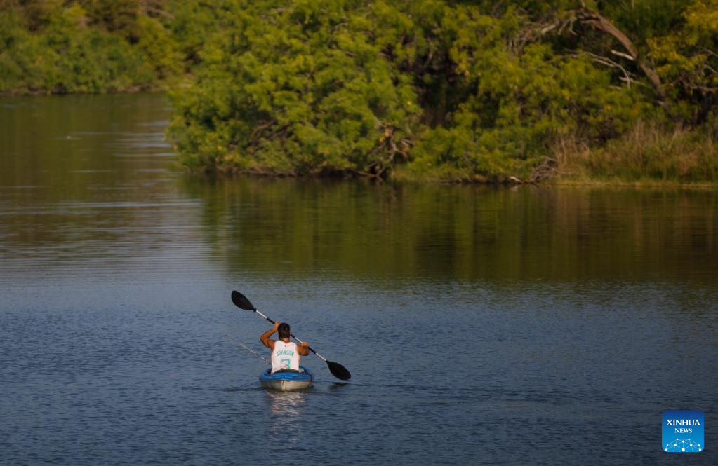 A man kayaks across Calaveras Lake in Bexar County, Texas, the United States, on July 18, 2022. More than 100 million people are currently under heat related warnings and advisories across the United States, the National Weather Service (NWS) Weather Prediction Center said on Tuesday. (Photo by Nick Wagner/Xinhua)