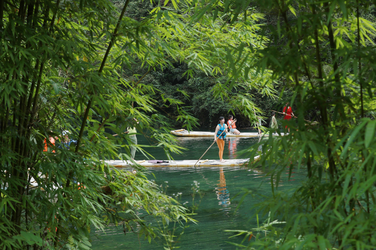 Photo taken on July 16, 2022 shows visitors experiencing bamboo rafting at Sanxia Bamboo Scenic Resort in Zigui county of Yichang city, Central China's Hubei province. [Photo/Xinhua]