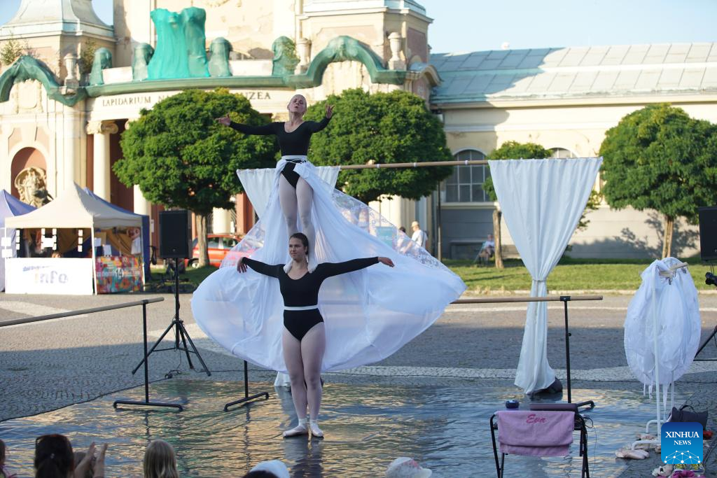 Two artists perform during the 14th Prague Street Theater Festival in Prague, the Czech Republic, July 19, 2022. The week-long festival, which saw more than 40 performances by artists from several countries, closed Tuesday in the Czech capital. (Photo by Dana Kesnerova/Xinhua)