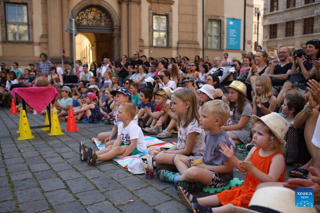 People watch a performance during the 14th Prague Street Theater Festival in Prague, the Czech Republic, July 19, 2022. The week-long festival, which saw more than 40 performances by artists from several countries, closed Tuesday in the Czech capital. (Photo by Dana Kesnerova/Xinhua)