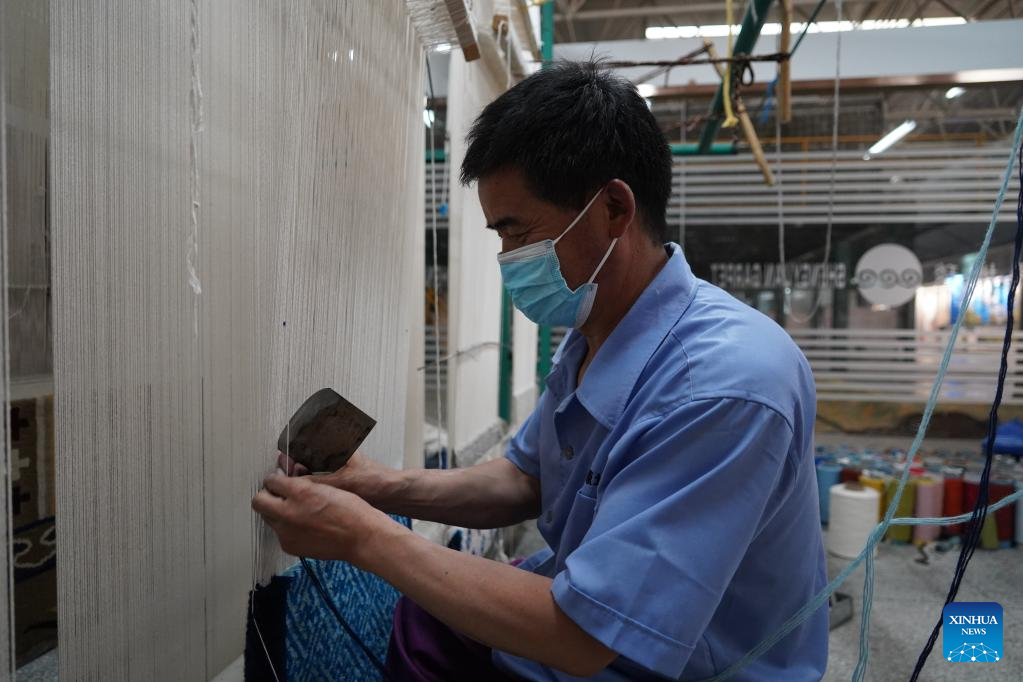 A worker makes Tibetan carpet at a factory in Xining, northwest China's Qinghai Province, July 8, 2022.