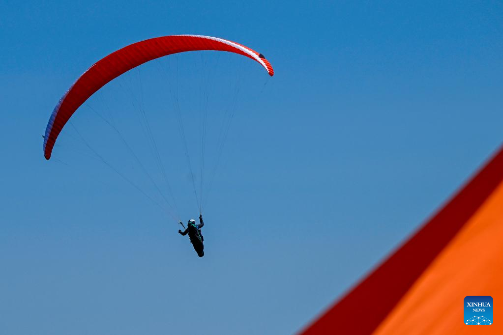 A pilot flies the paraglider during the 2022 Paragliding World Cup in Krushevo, North Macedonia, on July 20, 2022. The event is held here from July 14 to 21, 2022. (Photo by Tomislav Georgiev/Xinhua)