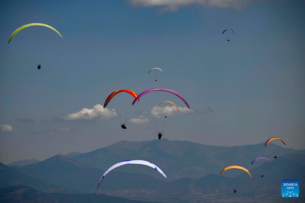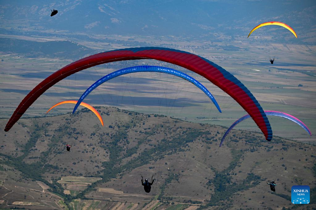 Pilots fly their paragliders during the 2022 Paragliding World Cup in Krushevo, North Macedonia, on July 20, 2022. The event is held here from July 14 to 21, 2022. (Photo by Tomislav Georgiev/Xinhua)