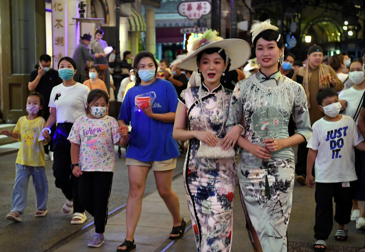 Tourists walk in a film town in Zhongmu county of Zhengzhou, Henan province on July 18. [Photo/Xinhua]