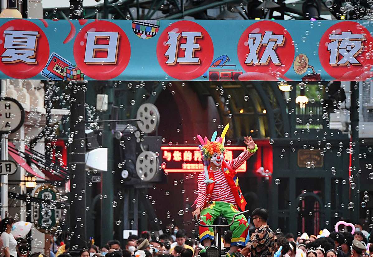 A clown puts on a performance at a film town in Zhongmu county of Zhengzhou, Henan province on July 18. [Photo/Xinhua]