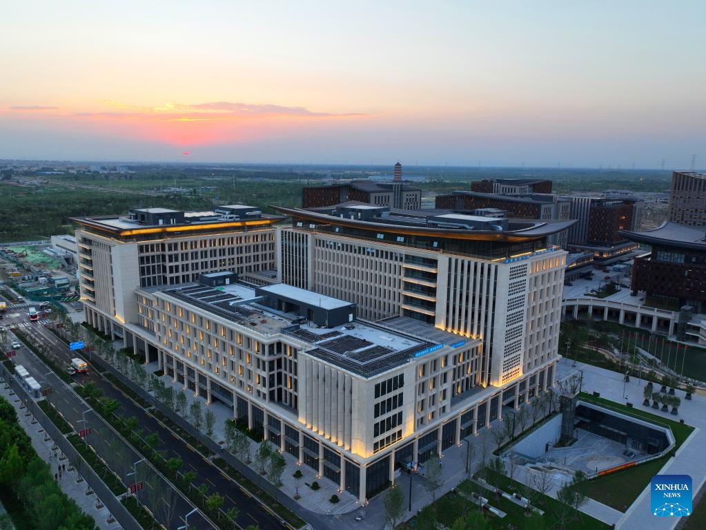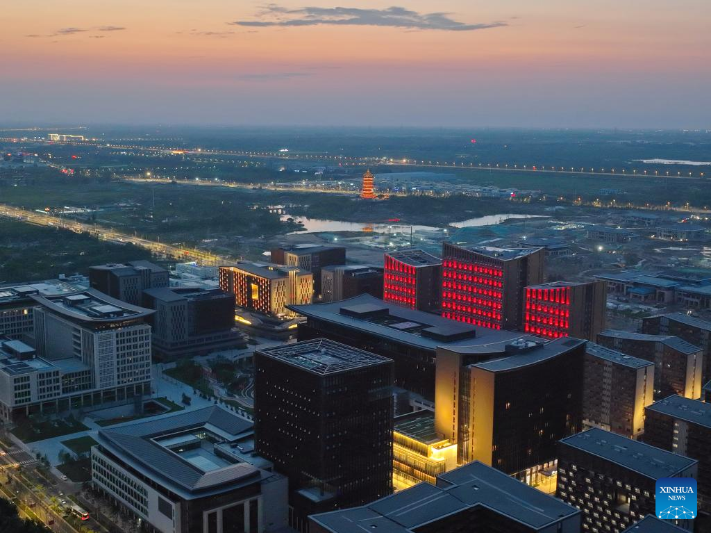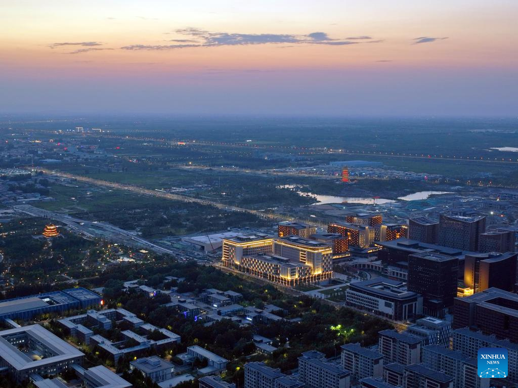 Aerial photo taken on July 20, 2022 shows a night view of the business service center in Xiong'an New Area, north China's Hebei Province. (Xinhua/Xing Guangli)