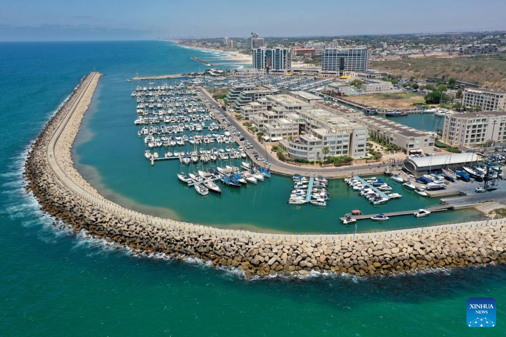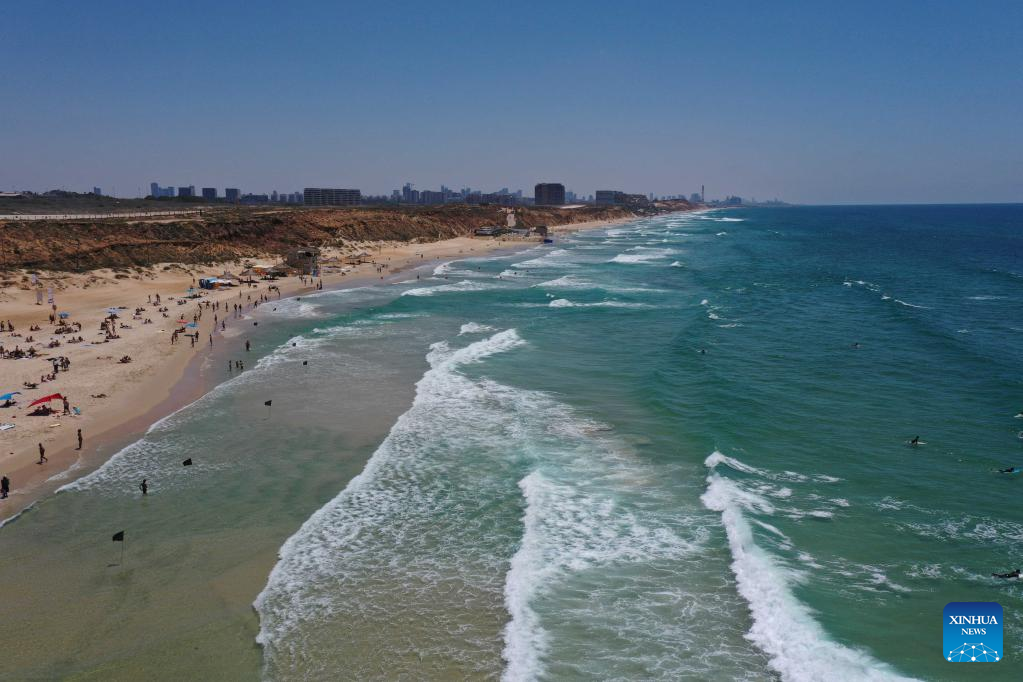 Aerial photo taken on July 20, 2022 shows the shore of Mediterranean Sea at Israeli city of Herzliya near Tel Aviv, Israel. (Photo by Gil Cohen Magen/Xinhua)