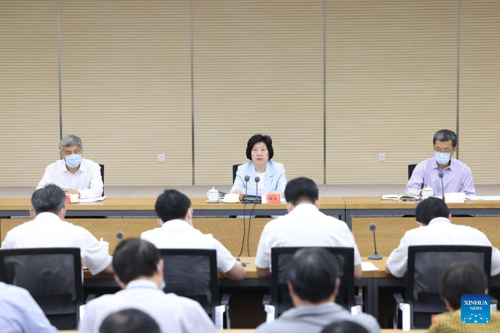 Chinese Vice Premier Sun Chunlan, also a member of the Political Bureau of the Communist Party of China Central Committee, meets with the participants of a seminar on the high-quality development of education in the new era, in Beijing, capital of China, July 21, 2022. (Xinhua/Liu Bin)
