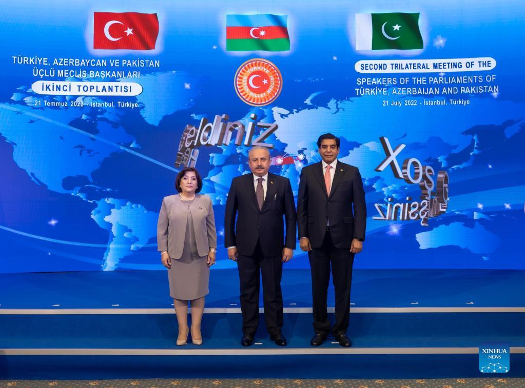 Speaker of the Grand National Assembly of Trkiye Mustafa Sentop (C), Speaker of the National Assembly of Azerbaijan Sahiba Gafarova (L), and Speaker of the National Assembly of Pakistan Raja Pervaiz Ashraf pose for a photo at the Second Trilateral Meeting of the Speakers of the Parliaments of Trkiye, Azerbaijan, and Pakistan, in Istanbul, Trkiye, on July 21, 2022. The new century is the "Asian century" filled with opportunities, said parliamentary speakers of Trkiye, Azerbaijan, and Pakistan in a meeting here on Thursday. (Xinhua)