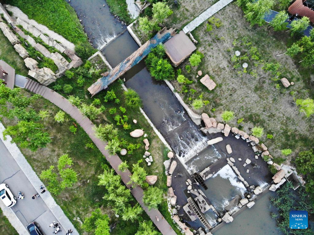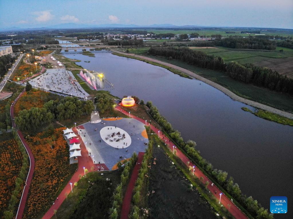People enjoy themselves in a waterscape scenic area in Tieli City, northeast China's Heilongjiang Province, July 21, 2022. In recent years, Tieli City has worked on water pollution control and water project construction, providing local residents with improved living environment. (Xinhua/Wang Song)