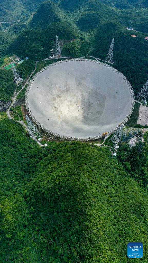Aerial photo taken on July 20, 2022 shows China's Five-hundred-meter Aperture Spherical Radio Telescope (FAST) under maintenance in southwest China's Guizhou Province. Using FAST, also dubbed as the "China Sky Eye," scientists have identified over 660 new pulsars since October 2017. (Xinhua/Ou Dongqu)