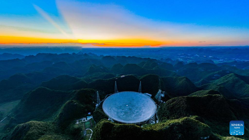 Aerial panoramic photo taken on July 21, 2022 shows China's Five-hundred-meter Aperture Spherical Radio Telescope (FAST) under maintenance in southwest China's Guizhou Province. Using FAST, also dubbed as the "China Sky Eye," scientists have identified over 660 new pulsars since October 2017. (Xinhua/Ou Dongqu)