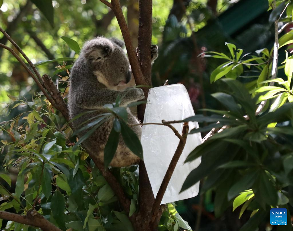 A Koala plays beside an ice cube at Chimelong Safari Park in Guangzhou, south China's Guangdong Province, July 22, 2022. The zoo tries every means to help animals fend off the summer heat in recent days. (Xinhua/Huang Guobao)