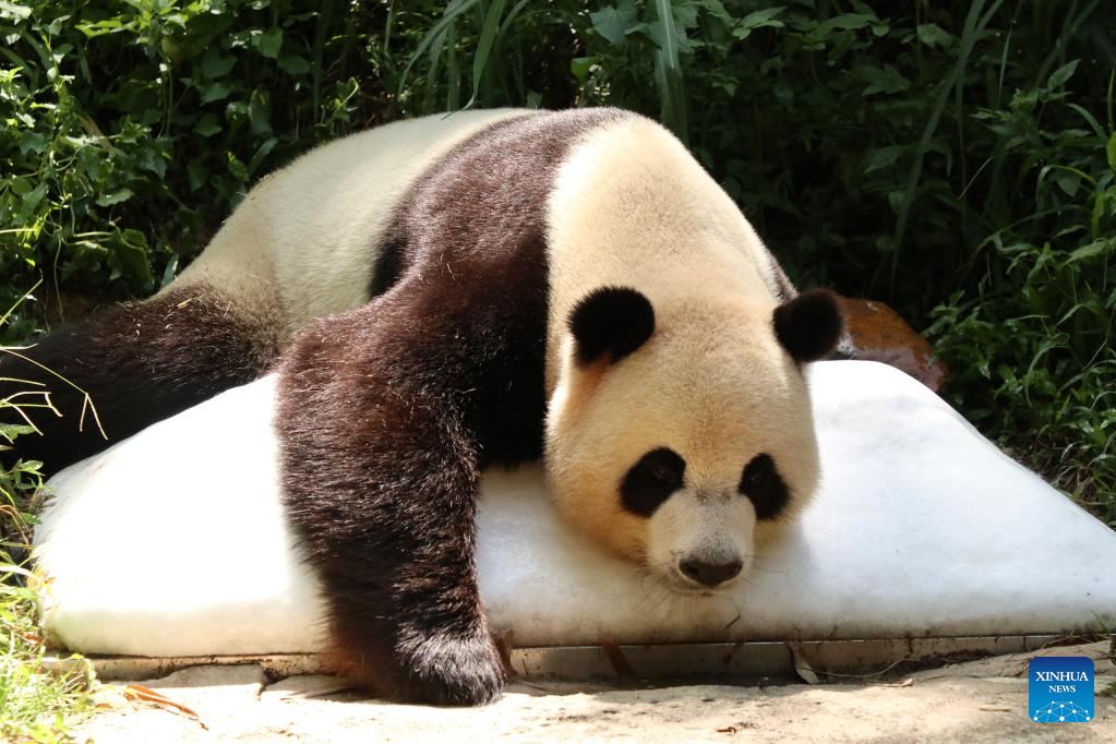 Giant panda Shuaishuai lies on an ice cube at Chimelong Safari Park in Guangzhou, south China's Guangdong Province, July 22, 2022. The zoo tries every means to help animals fend off the summer heat in recent days. (Xinhua/Huang Guobao)
