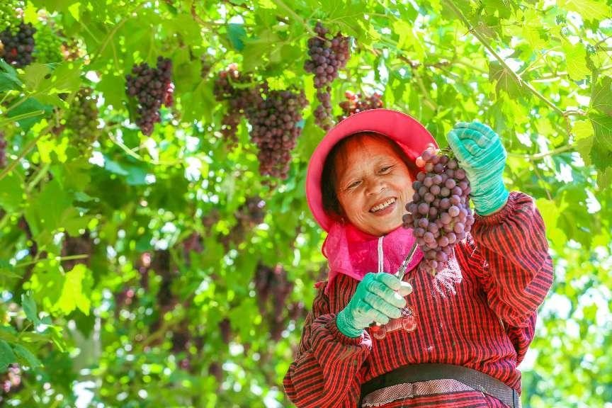 A farmer picks, sorts and packs grapes in a grape plantation in Hutubi county, Hui autonomous prefecture of Changji, northwest China's Xinjiang Uygur autonomous region, July 20, 2022. (People's Daily Online/Ma Guangyuan)