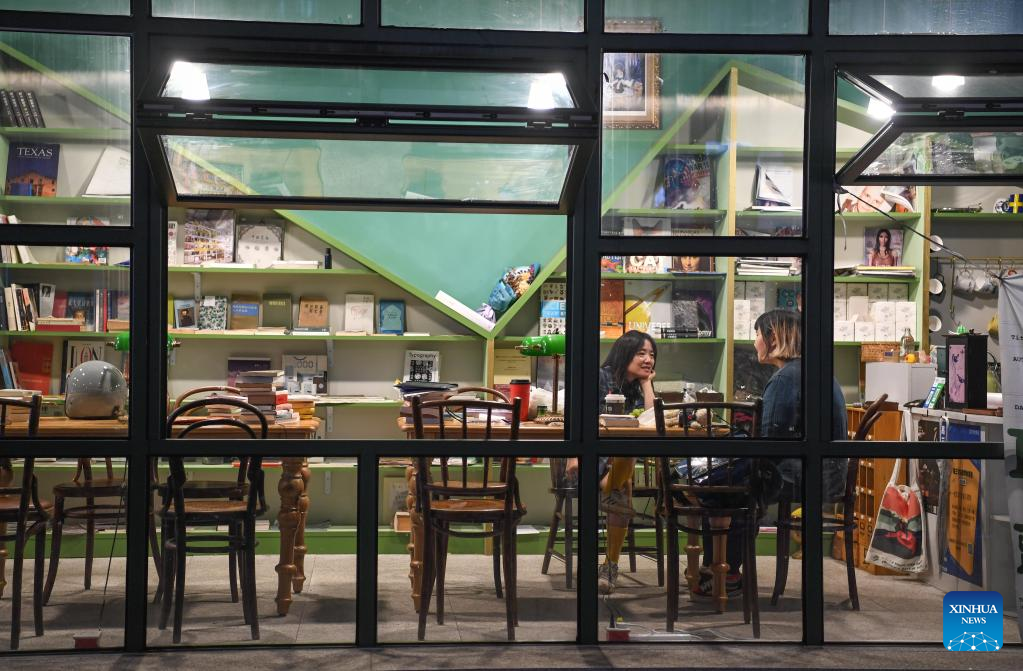 People chat in a bookstore at the Qingyun Road in Nanming District of Guiyang, capital city of southwest China's Guizhou Province, July 21, 2022.