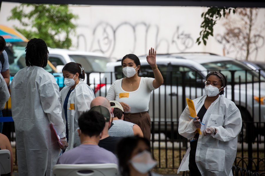 Health care workers assist people waiting to be vaccinated at a monkeypox vaccination site in New York, the United States, on July 14, 2022. (Photo by Michael Nagle/Xinhua)