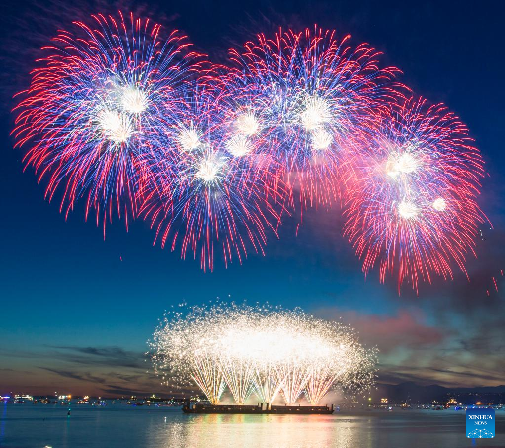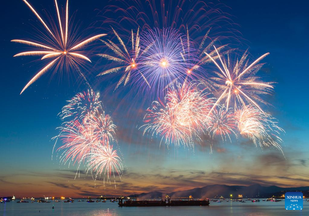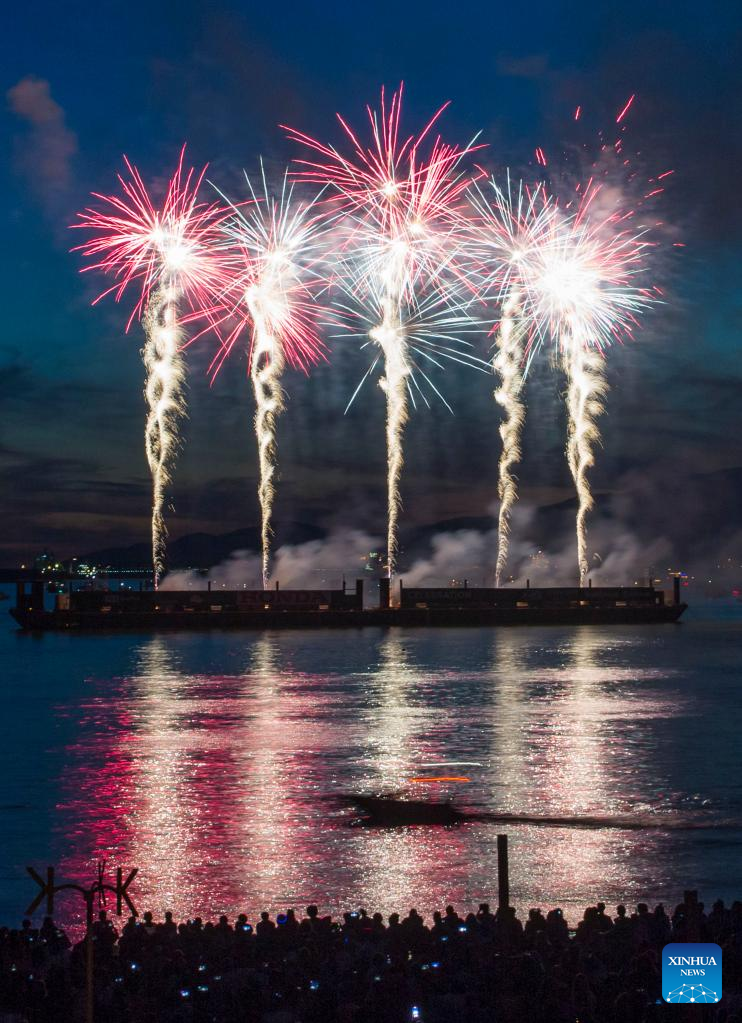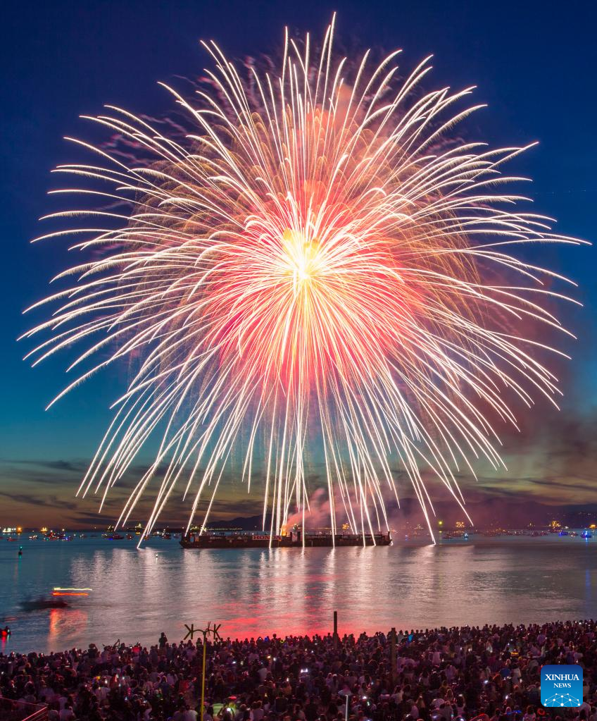 Fireworks presented by team Japan light up the sky during the 30th annual Celebration of Light at English Bay in Vancouver, British Columbia, Canada, on July 23, 2022. The 30th Celebration of Light fireworks competition kicked off by team Japan on Saturday, followed by team Canada on July 27 and team Spain on July 30. (Photo by Liang Sen/Xinhua)