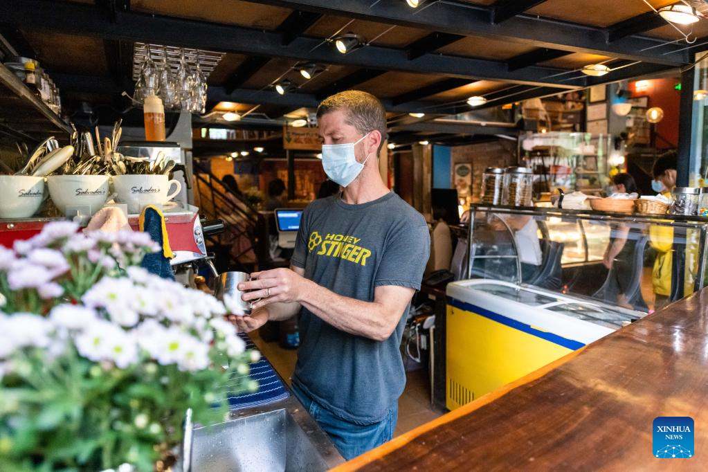 Colin Flahive makes coffee at Salvador's cafe in Kunming, southwest China's Yunnan Province, July 11, 2022. (Xinhua/Cao Mengyao)