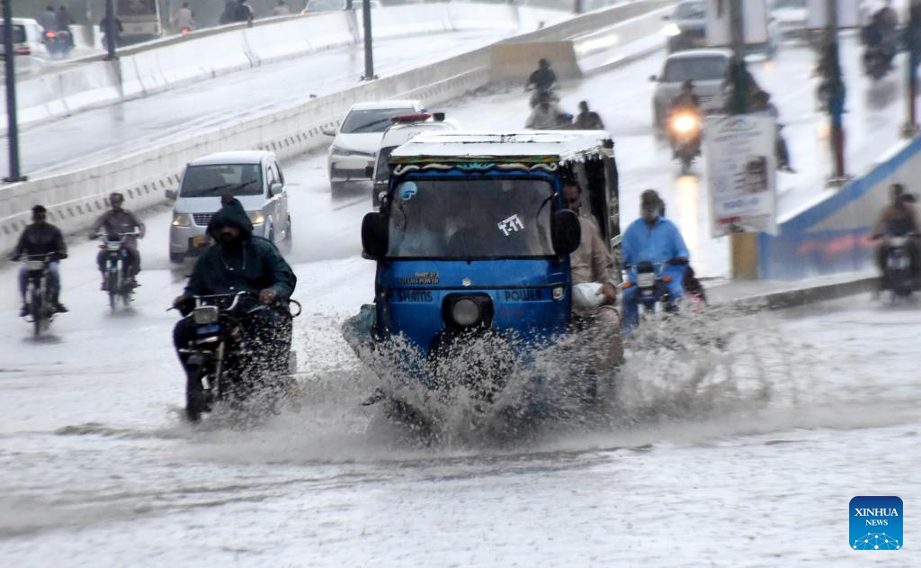 Vehicles run on a flooded road after heavy rain in southern Pakistani port city of Karachi, on July 25, 2022. Around 310 people have been killed and 295 others injured in separate rain-related incidents in Pakistan since June 14 as heavy downpours continued to lash the country, the National Disaster Management Authority (NDMA) said. (Str/Xinhua)