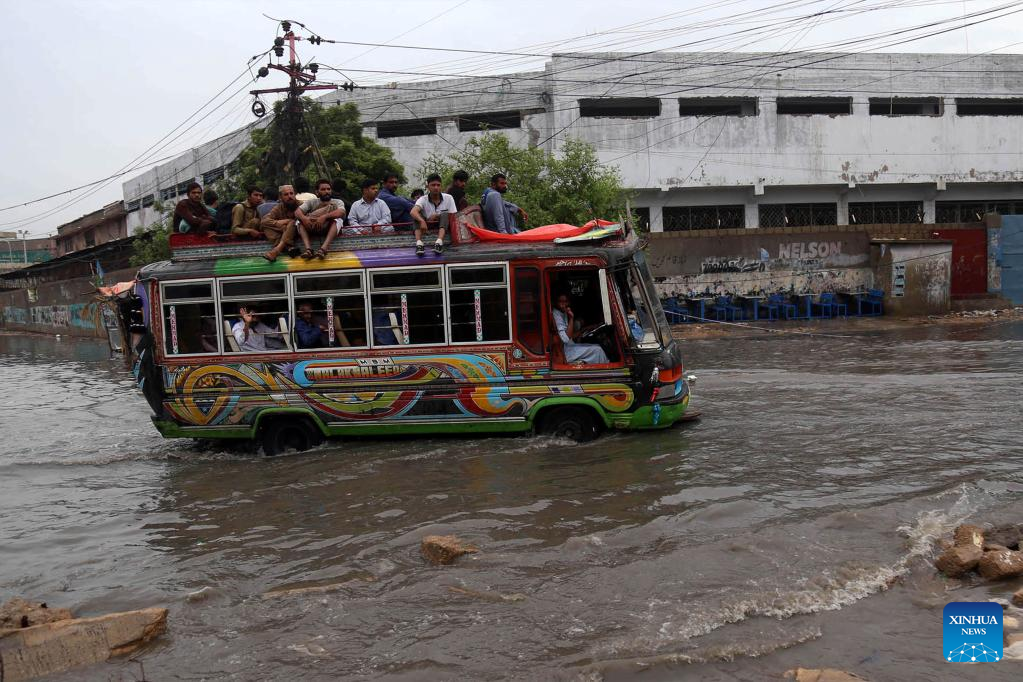 A passenger bus runs on a flooded road after heavy rain in southern Pakistani port city of Karachi, on July 25, 2022. Around 310 people have been killed and 295 others injured in separate rain-related incidents in Pakistan since June 14 as heavy downpours continued to lash the country, the National Disaster Management Authority (NDMA) said. (Str/Xinhua)