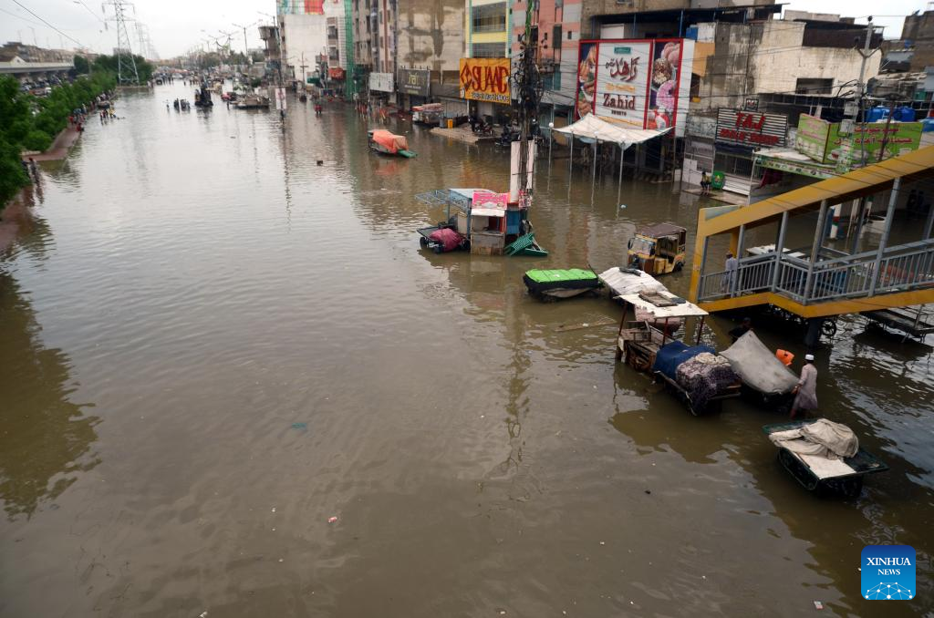 Photo taken on July 25, 2022 shows a flooded area after heavy rain in southern Pakistani port city of Karachi. Around 310 people have been killed and 295 others injured in separate rain-related incidents in Pakistan since June 14 as heavy downpours continued to lash the country, the National Disaster Management Authority (NDMA) said. (Str/Xinhua)