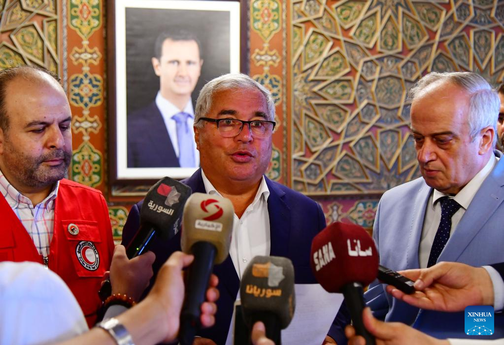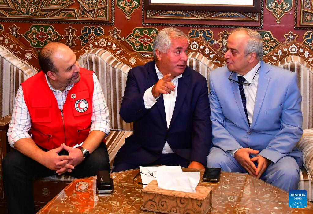 Zabidullah Zabidov (C), the ambassador of Tajikistan in Kuwait, meets with officials from the Asia Department of the Syrian foreign ministry and the Syrian Arab Red Crescent in Damascus, Syria, on July 25, 2022. Syria on Monday handed over a total of 146 Tajik nationals, who are family members of Islamic State (IS) militants, to their home country, according to the state news agency SANA. (Photo by Ammar Safarjalani/Xinhua)