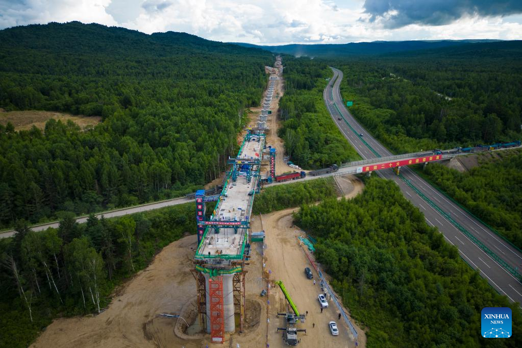 Aerial photo taken on July 25, 2022 shows the construction site of a super major bridge along the Harbin-Yichun high-speed railway, northeast China's Heilongjiang Province. Crossing permafrost regions, the Harbin-Yichun high-speed railway will total approximately 300 kilometers, connecting the cities of Harbin, Suihua, and Yichun. (Xinhua/Zhang Tao)
