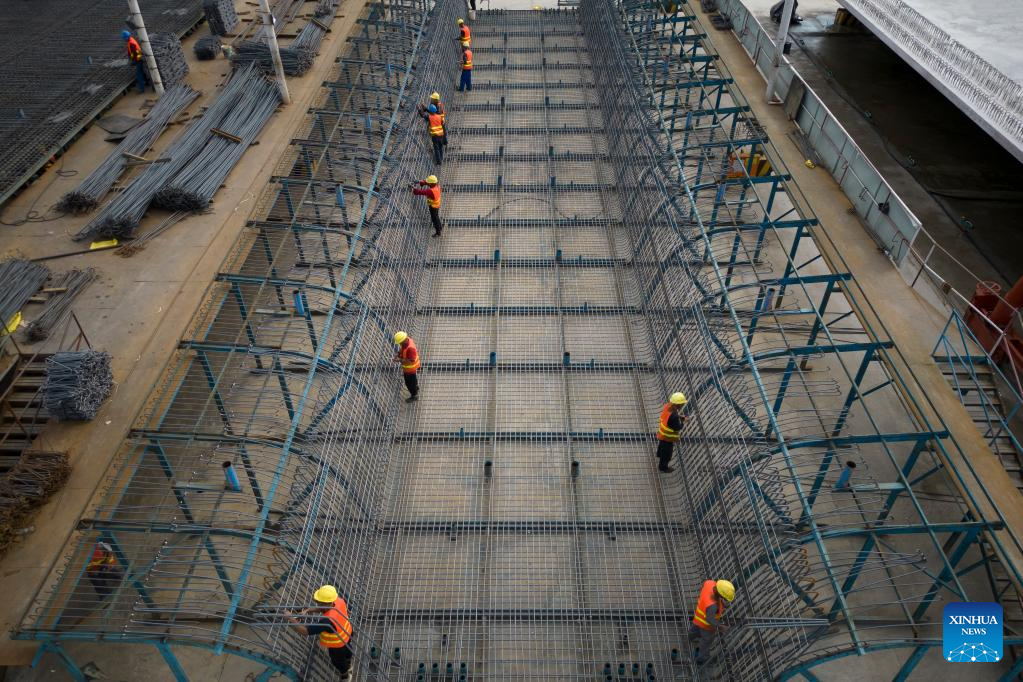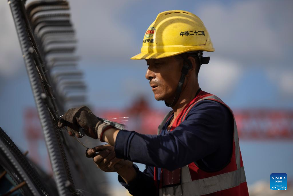 A worker operates at a beam fabrication yard in Yichun, northeast China's Heilongjiang Province, on July 25, 2022. Crossing permafrost regions, the Harbin-Yichun high-speed railway will total approximately 300 km with a designed speed of 250 km per hour. (Xinhua/Zhang Tao)