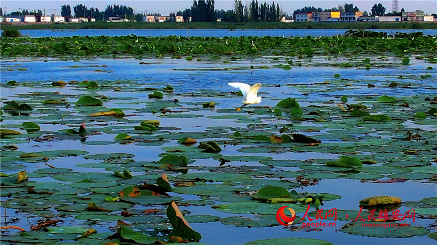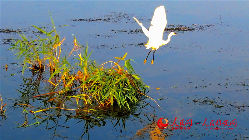 A little egret flies over Baiyangdian Lake in the Xiong’an New Area, north China’s Hebei Province. (Photo/Gao Teng)