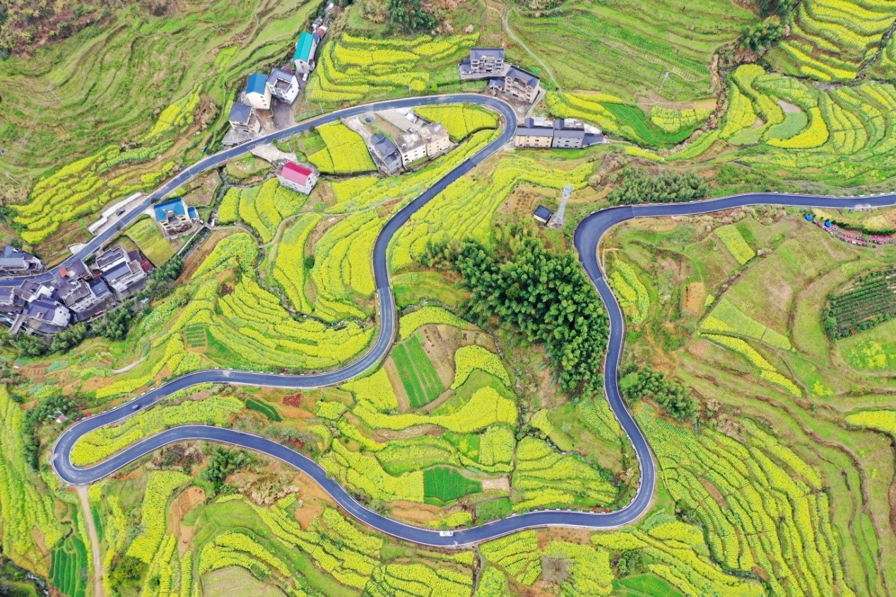 Photo taken on March 26, 2022 shows a winding road in Yueling village, Daxibian township, Kaihua county, Quzhou, east China's Zhejiang province. (People's Daily Online/Wang Jianlin)