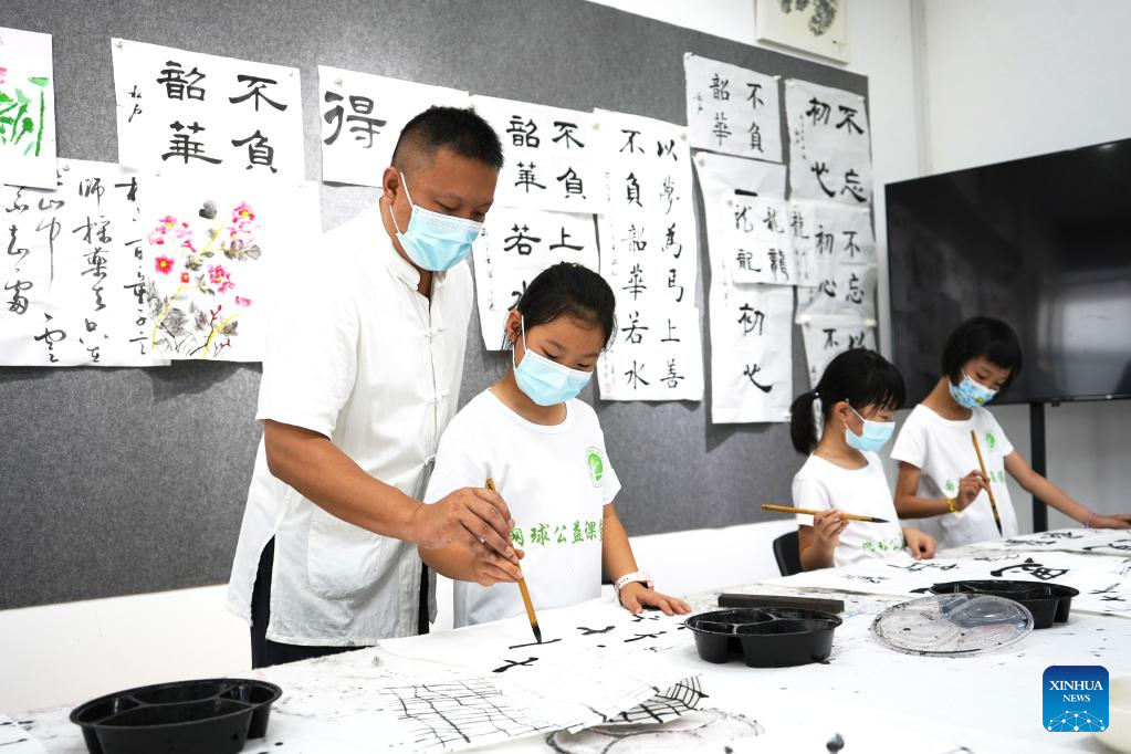Children practice Chinese calligraphy as a part of a summer camp program at the National Olympic Sports Center in Beijing, capital of China, July 26, 2022. (Xinhua/Jin Haoyuan)