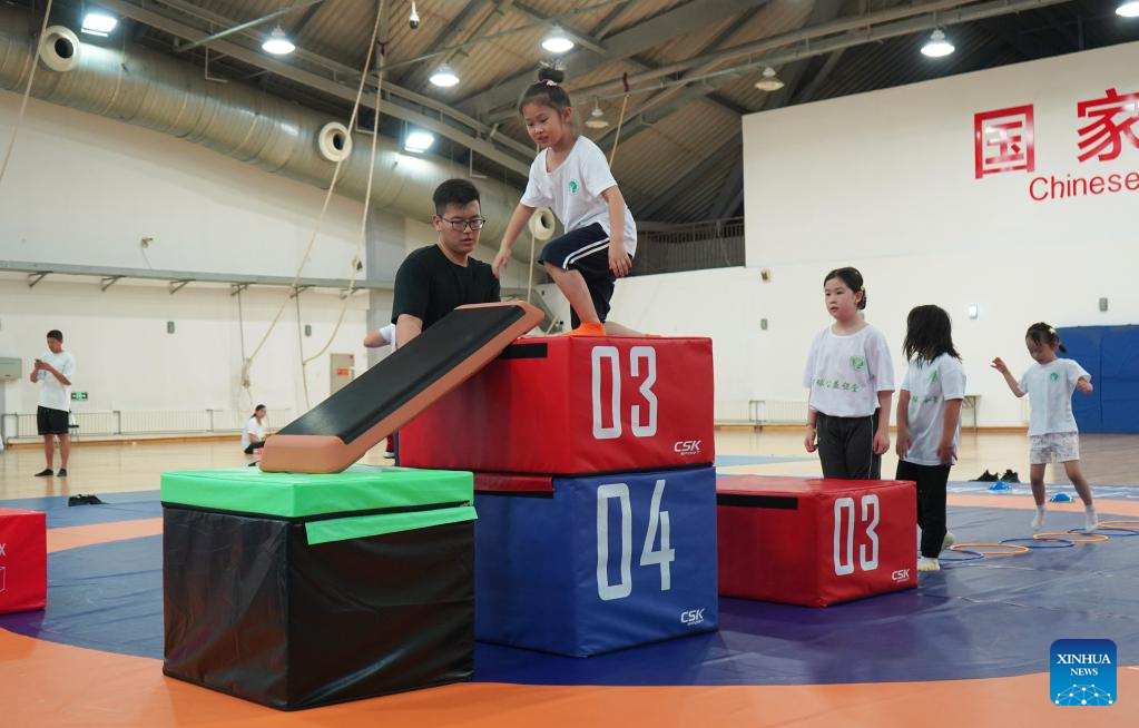 Children participate in a physical traning as a part of a summer camp program at the National Olympic Sports Center in Beijing, capital of China, July 26, 2022. (Xinhua/Jin Haoyuan)