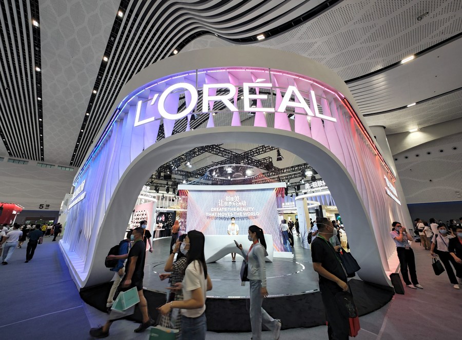 Photo taken on July 26, 2022 shows the booth of cosmetics giant L'Oreal in the French pavilion at the second China International Consumer Products Expo (CICPE) in Haikou, south China's Hainan Province. (Xinhua/Guo Cheng)