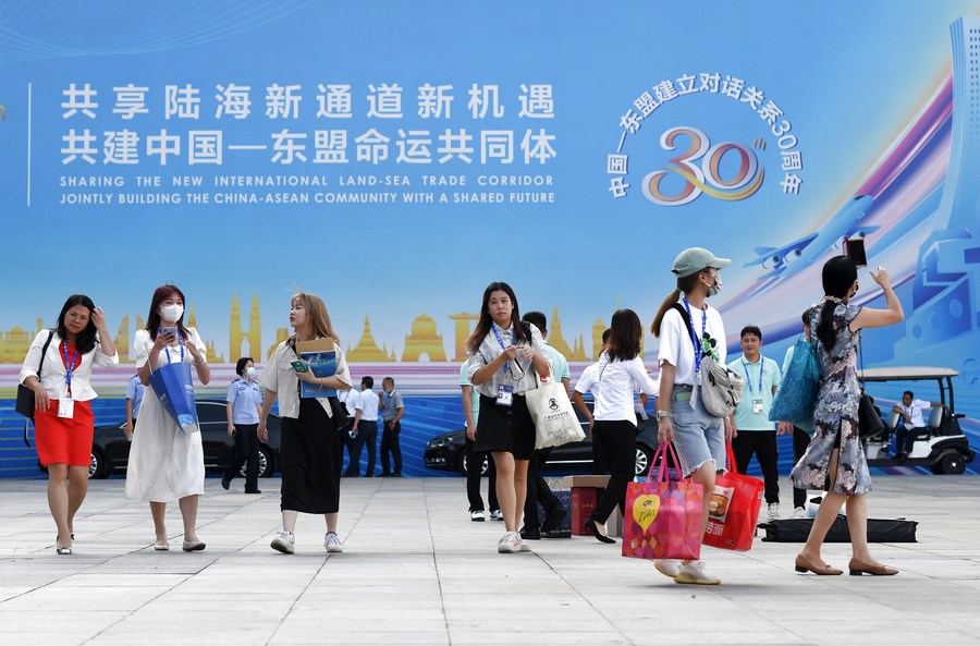 People walk out of the venue of the 18th China-ASEAN Expo in Nanning, capital of south China's Guangxi Zhuang Autonomous Region, Sept. 11, 2021. (Xinhua/Lu Boan)