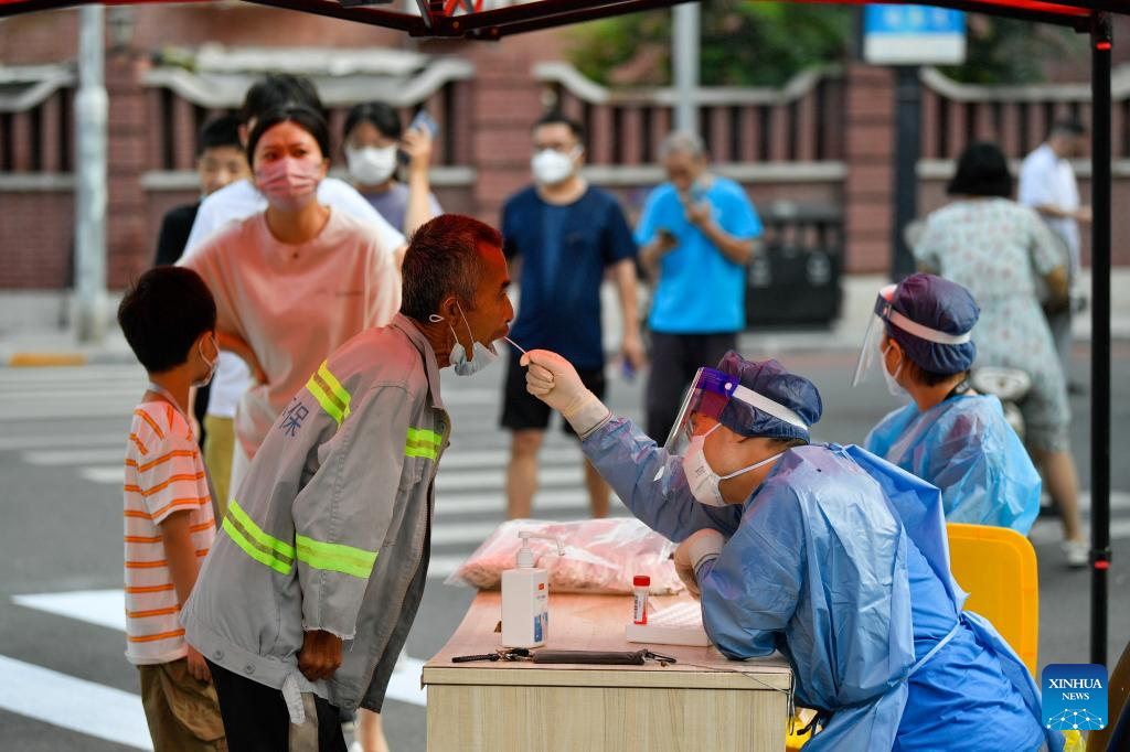 A medical worker takes a swab sample from a citizen for nucleic acid testing at Heping District in Tianjin, north China, July 24, 2022. (Xinhua/Sun Fanyue)