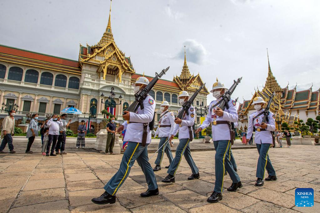 Tourists watch guards on patrol at the Grand Palace scenic spot in Bangkok, Thailand, on July 31, 2022. Thailand received more than 2 million foreign tourists in the first half of 2022. According to the forecast of the Ministry of Tourism and Sports, the number of tourists is expected to reach 9 million in this year. (Xinhua/Wang Teng)