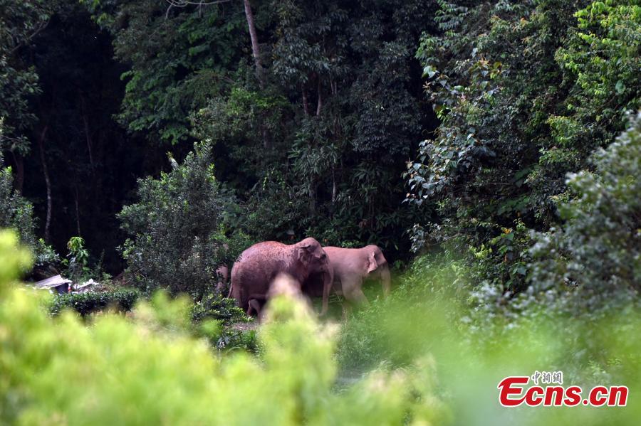 A herd of wild Asian elephants and a calf wander in the village of Mankelao, Puer, southwest China's Yunnan Province, July 31, 2022. Monitors have closely managed to follow the wild Asian elephants in Yunnan. (Photo: China News Service/Li Jiaxian)
