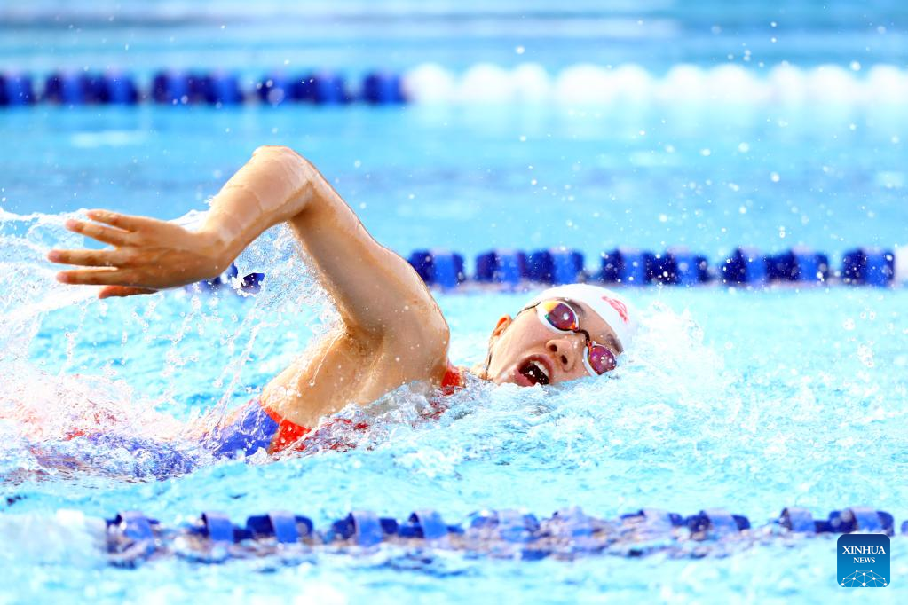 Xie Linzhi of China competes in the swimming of the team-relay mix at the UIPM 2022 Pentathlon World Championships in Alexandria, Egypt, July 31, 2022. (Xinhua/Ahmed Gomaa)