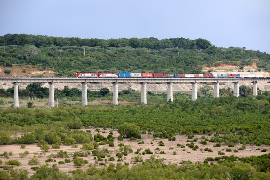A freight train runs on the Mombasa-Nairobi Railway track bypassing the mangroves in Mombasa, Kenya, on July 27, 2022. (Xinhua/Dong Jianghui)