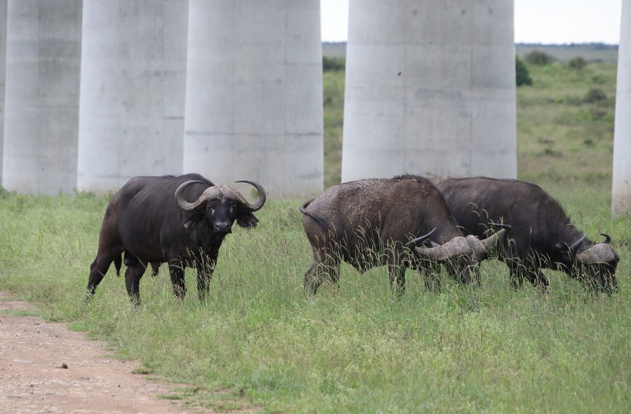Several buffaloes pass through the animal passages of the Nairobi National Park Super Major Bridge equipped with noise deflectors in Nairobi, Kenya, on May 19, 2021. (Xinhua/Dong Jianghui)