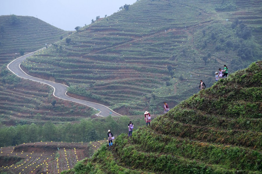 Farmers work at a tea plantation, where white tea seedlings were donated by Huangdu Village of Anji County of Zhejiang Province, in Tunshang Village of Pu'an County, southwest China's Guizhou Province, July 7, 2019. (Xinhua/Yang Wenbin)
