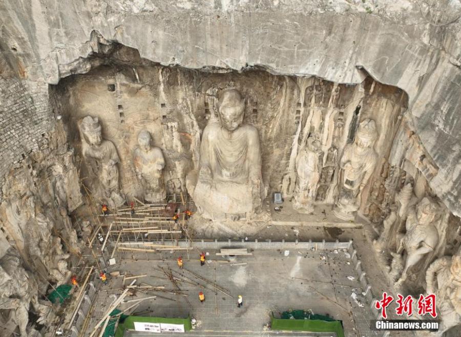 Workers dismantle the scaffolds at the Fengxian Temple of the Longmen Grottoes in Luoyang, central China's Henan Province, Aug. 2, 2022. (Photo: China News Service/Hu Pengda)