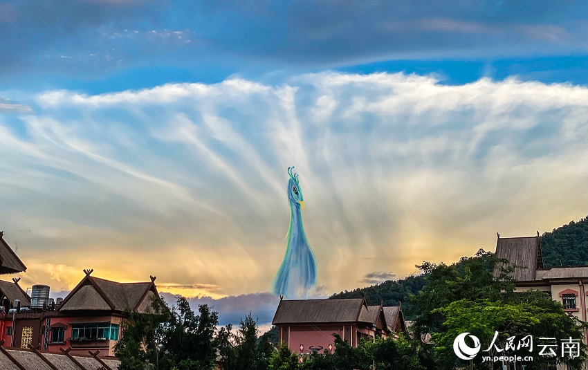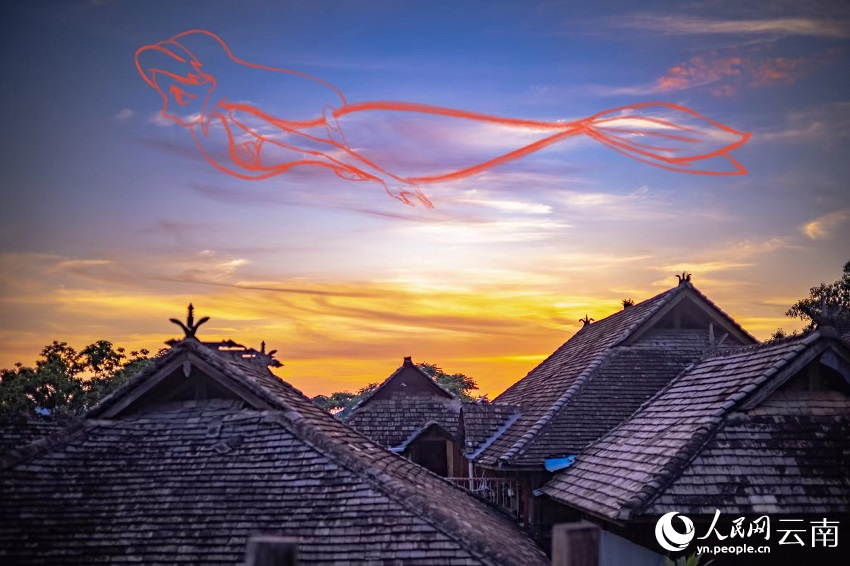 Beautiful clouds during sunset above the sky in Simao district, Pu’er city, southwest China’s Yunnan Province. (Photo courtesy of the media convergence center of Simao district, Pu’er city; image in the same photo drawn by Li Xiaoran)