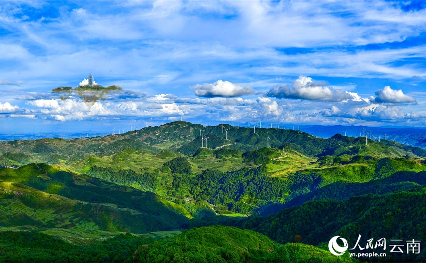 Photo shows clouds in the sky surrounding Daheishan Mountain in Kaiyuan City of the Honghe Hani and Yi Autonomous Prefecture in southwest China’s Yunnan Province. (Photo taken by Wang Yingquan; image in the same photo drawn by Li Xiaoran)