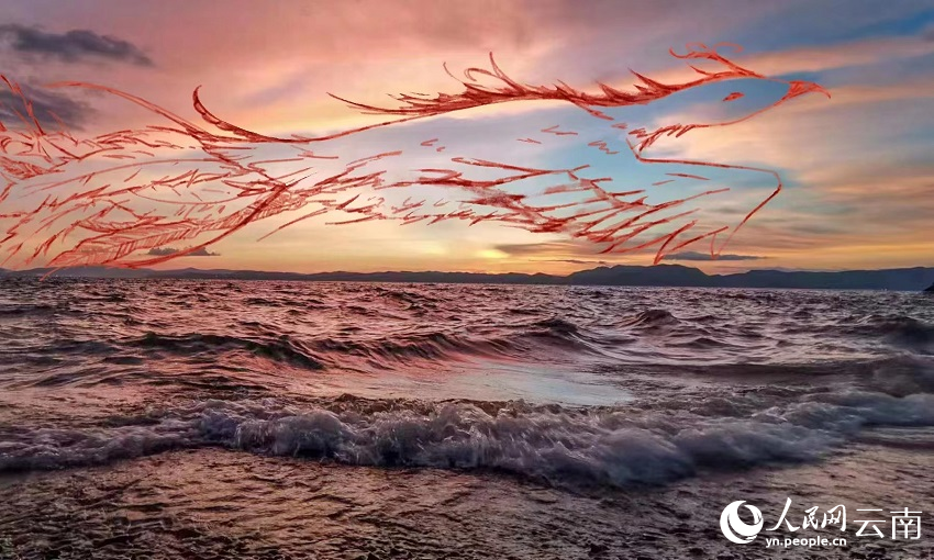 Photo shows clouds in the sky during a sunset at Dianchi Lake in Haiyan village, Kunming, southwest China’s Yunnan Province. (Photo taken by Liu Yi of People’s Daily Online; image in the same photo drawn by Li Xiaoran)